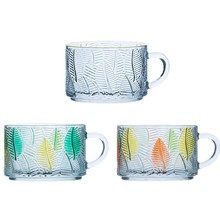3. Die Frühstückstasse hat transparentes und helles Glas, das mit schillernden Licht scheint.