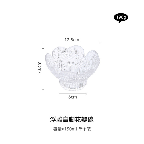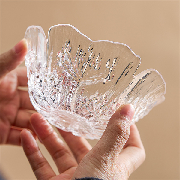 Glasschale mit Blütenblattprägung, frischer und eleganter Form und hohem Erscheinungsbild, französischer Prägestruktur auf der Oberfläche, eine blütenblattförmige Schale, die auf den ersten Blick atemberaubend ist. Geprägte Textur auf der Oberfläche, voller Sinn für Design. Das transparente und dicke Glas macht das Essen köstlicher. Der unregelmäßige Schüsselrand hat eine lebendige Schönheit. Kunstwerke verleihen Glaswaren in der Regel einen neuen Charme. Nutzen Sie unbegrenzte, vielseitige Süße, die Sie jeden Tag begleitet. Halten Sie eine Schüssel Dessert, eine Tasse Joghurt und einen Tee bereit. Wenn Sie das Dessert mit einem vollen Sinn für Rituale füllen, wird alles, was Sie essen, zu einem Augenschmaus. Lieferkette der E-Commerce-Plattform für Glas-Haushaltsprodukte von INTOWALK
